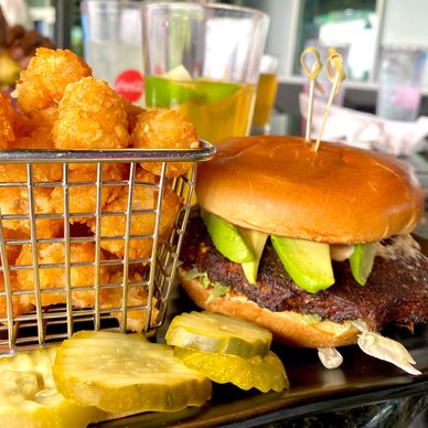 This burger truly wowed me when it arrived to the table, and yes, add avocado. The black bean patty held together so well. Delicious tater tots and fries too. We suggest eating first AND then go play.